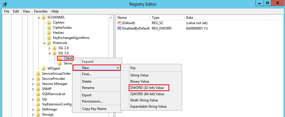 7. คลิกขวาที่ Client และเลือก New > DWORD (32 bit ) Value