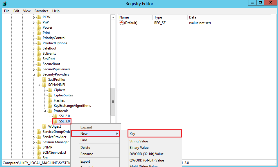 5. คลิกขวาที่ Protocol ที่สร้างใหม่จากข้อ 4 แล้วเลือก New > Key (กรณีนี้ยกตัวอย่าง SSL 3.0)