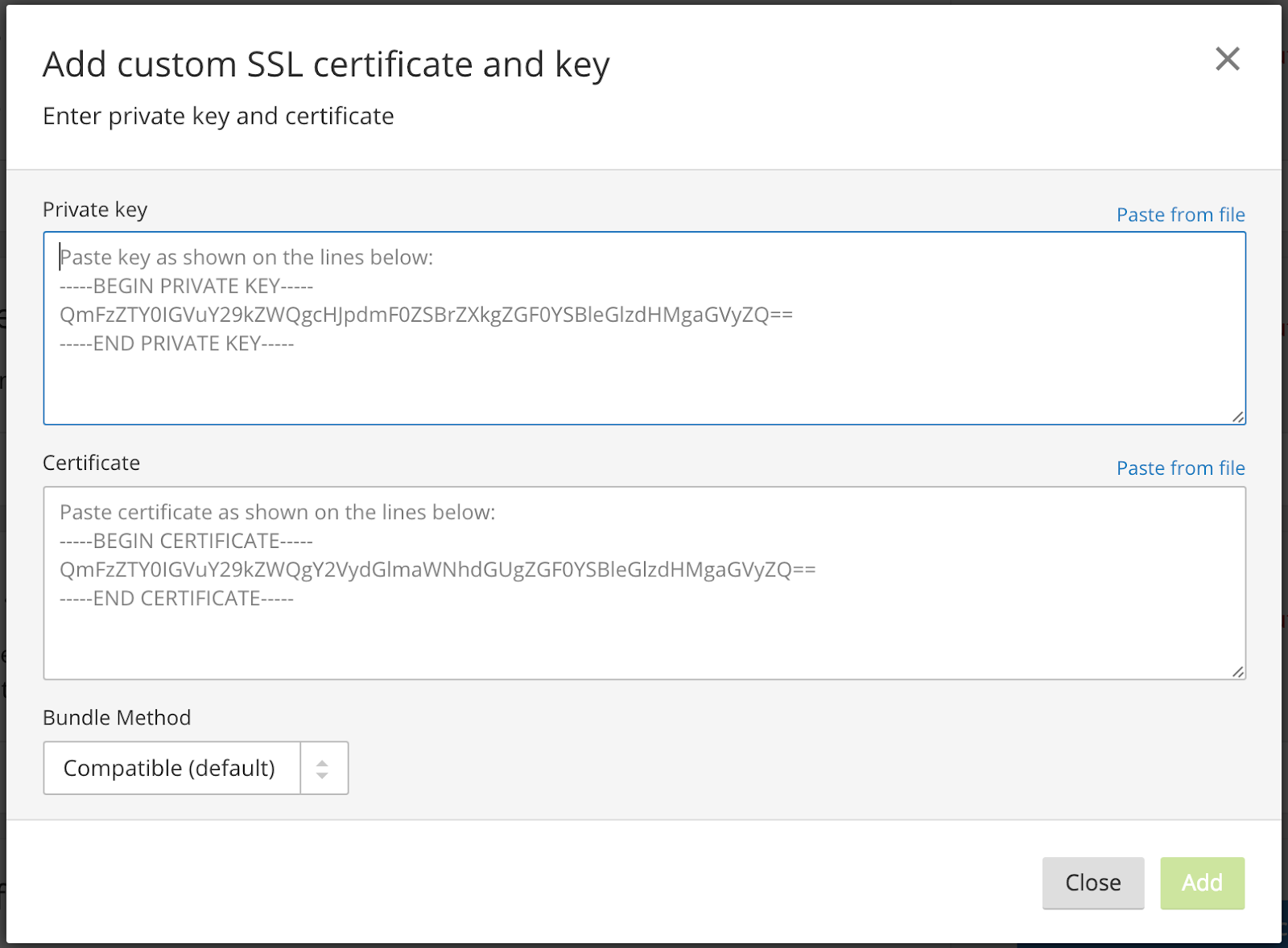 3. A window will open asking for your key, certificate and bundle information. Enter in the appropriate information and press on the "Add" button.