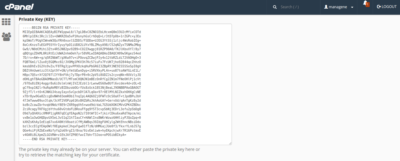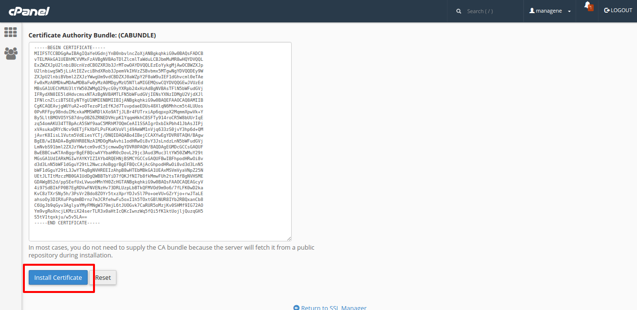 9. ขั้นตอนถัดมาในส่วน Certificate Authority Bundle: (CABUNDLE) ให้นำ Intermediate CA ที่ได้รับจากทีมงาน นำมาใส่ในช่องว่าง (หากได้รับเป็นไฟล์ให้เปิดไฟล์ด้วยโปรแกรม Text Editor (แนะนำ WordPad, Notepad++)