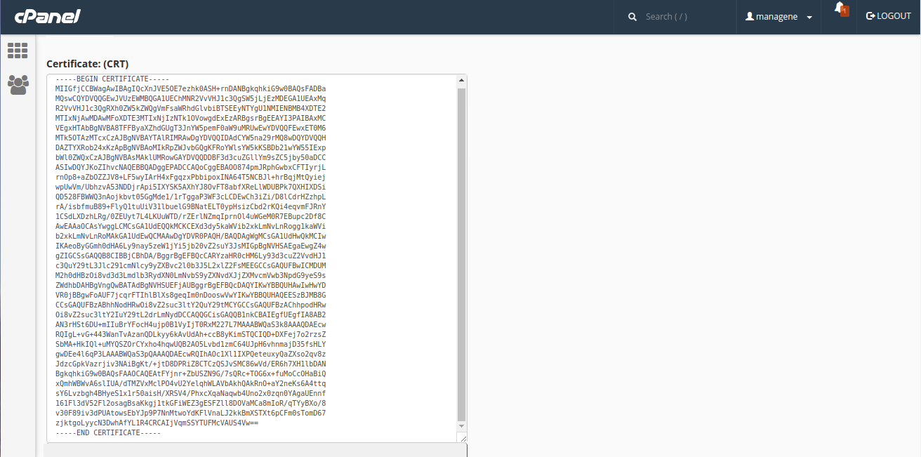 7. ในส่วนของ Certificate (CRT) ให้นำ SSL Certificate ที่ได้รับจากทางทีมงานใส่ลงไป (หากได้รับเป็นไฟล์ให้เปิดไฟล์ด้วยโปรแกรม Text Editor (แนะนำ WordPad, Notepad++)