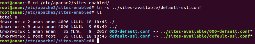 3.3 ให้รันคำสั่งต่อไปนี้ เพื่อเรียกใช้งาน default-ssl.conf มายังโฟลเดอร์ sites-enabled