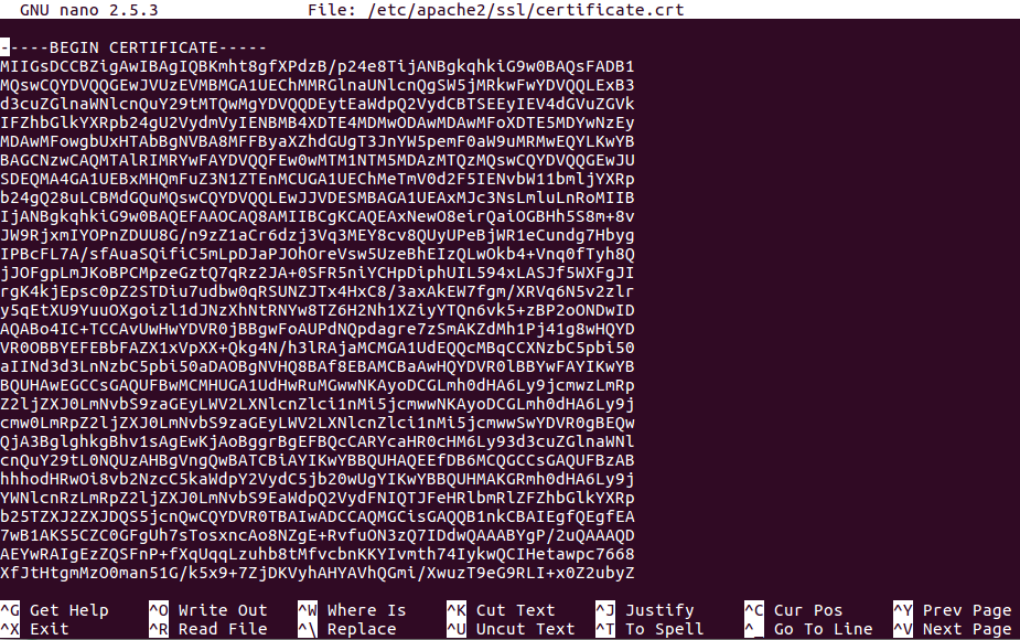 1. ทำการสร้างไฟล์ certificate.crt สำหรับเก็บ SSL certificate Code โดยพิมพ์คำสั่ง ด้านล่างนี้ และนำ Code SSL certificate ที่ได้รับใส่ลงไป