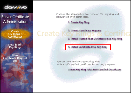 9. ให้ไปที่ Server Certificate Administration แล้วเลือก Install Certificate Into Key Ring ดังภาพ