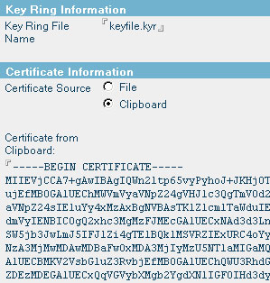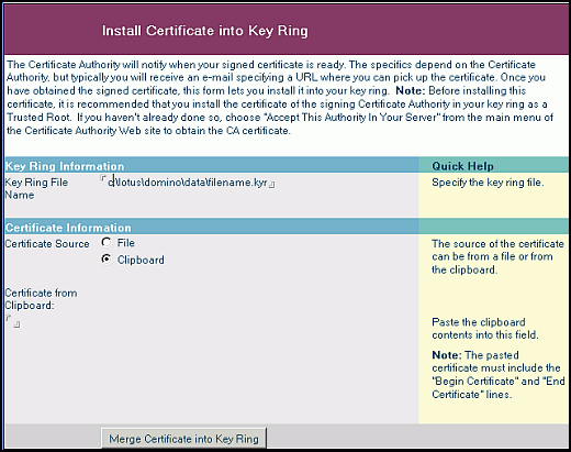 11. ในส่วน Certificate Information ให้ทำการระบุ SSL Certificate Path ที่ได้สร้างไว้ หรือเลือก Clipboard แล้วนำ Code SSL Certificate ที่ขึ้นต้นด้วย BEGIN CERTIFICATE และลงท้ายด้วย END CERTIFICATE มาวาง แล้วทำการคลิ๊ก Merge Certificate into Key Ring เพื่อเสร็จสิ้นขั้นตอนการติดตั้ง