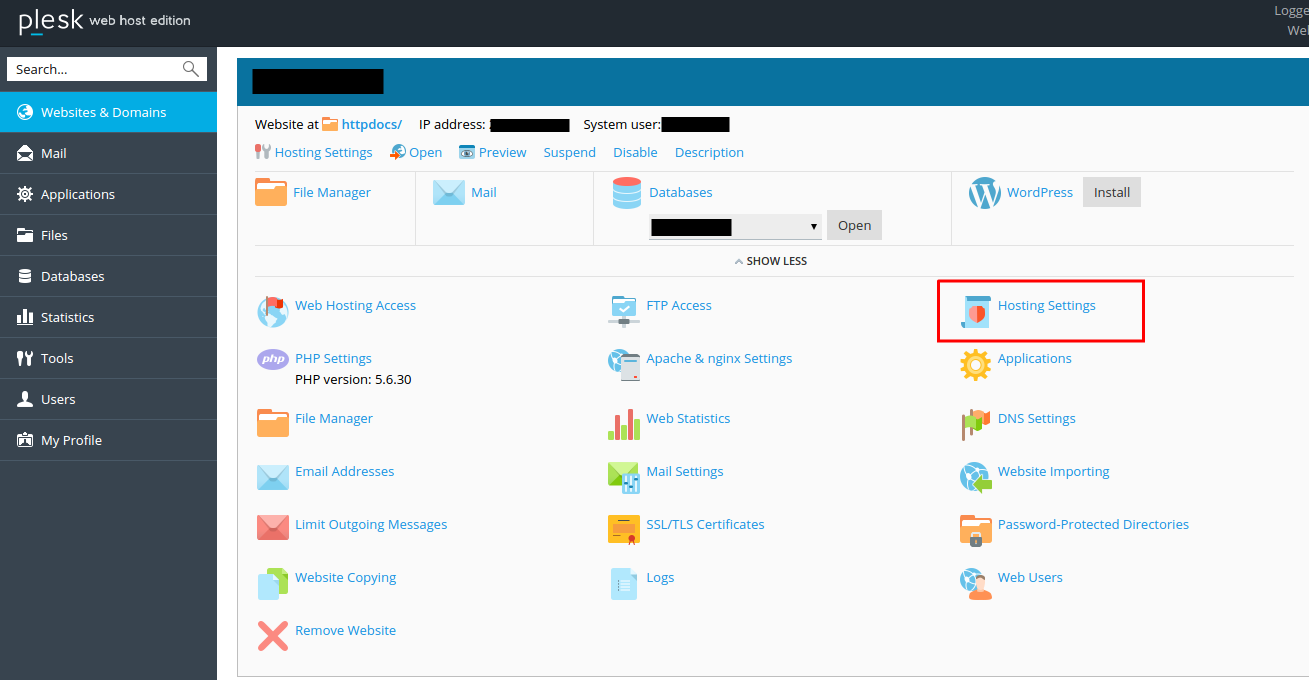 5. หลังจากนั้นให้กลับสู่เมนูหลัก Websites & Domains และไปที่เมนู Hosting Settings ของโดเมนที่ผู้ใช้งานต้องการติดตั้ง เพื่อเรียกใช้งาน SSL certificate ที่ได้ติดตั้งเข้าไป