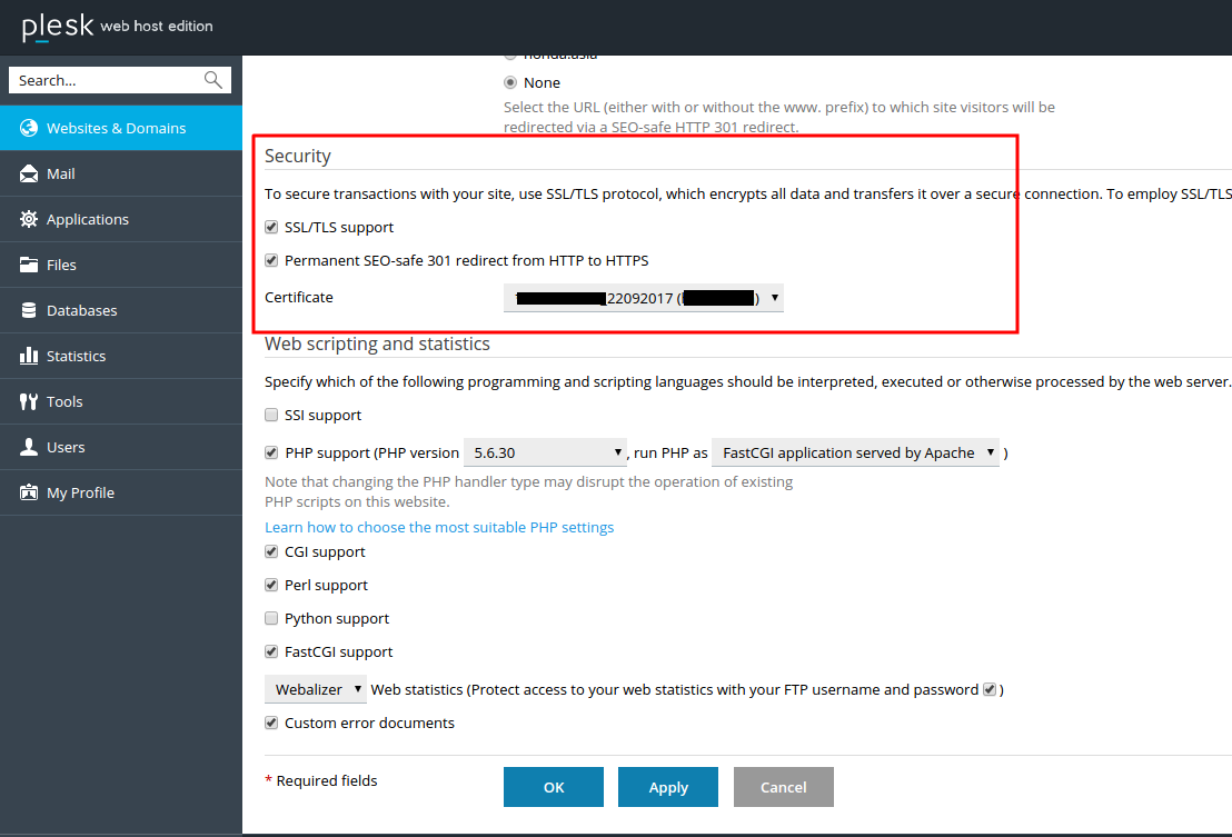 6. เมื่อเข้าสู่ Hosting Settings ไปที่หัวข้อ Security และเลือก Certificate เป็นตัวใหม่ที่ผู้ใช้งานติดตั้งไป และกด OK ด้านล่าง
