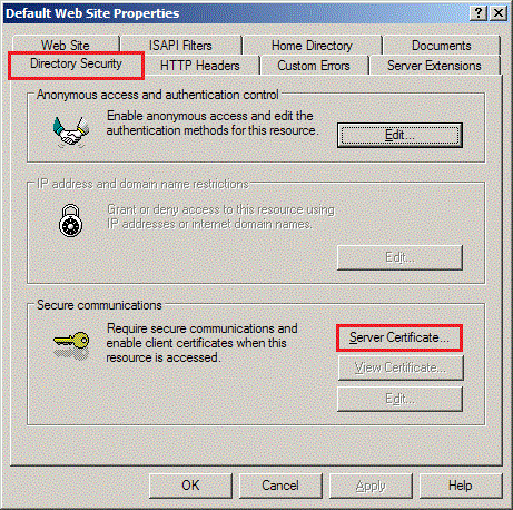 5. ไปที่แท็บ Directory Security จากนั้นเลือก Server Certificate…