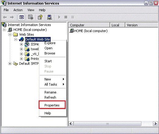 4. คลิกขวาที่ Web Sites ที่ต้องการ (กรณีสร้าง CSR ผ่าน Dummy Site ก็ต้องทำการเลือกที่ Dummy Site) เลือก Properties