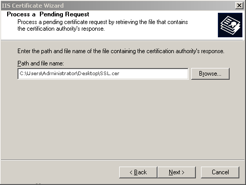 7. เลือกไฟล์ SSL Certificate ที่เตรียมไว้ จากนั้นกด Next และทำตามขั้นตอนจนจบ Wizard