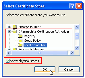 11. ติ๊กถูกที่ “Show physical stores” จากนั้นไปที่ Store ในส่วนของโฟลเดอร์ “Intermediate Certification Authorities” และเลือก “Local Computer” และกด OK