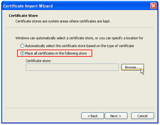 10. เลือก “Place all certificates in the following store” และกด Browse