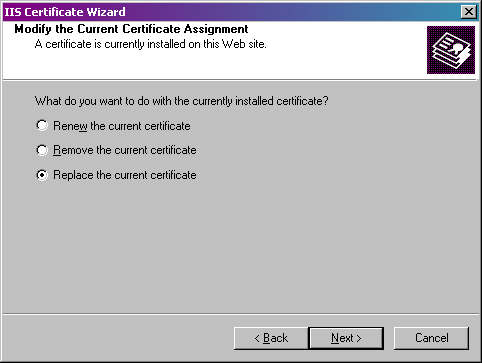 8. กรณีติดตั้ง SSL บน Dummy Site ให้ทำการลบ Dummy Site ได้เลย (หากไม่ใช่ ให้ข้ามขั้นตอนนี้แล้วดำเนินการตามข้อ 9 ต่อไป) หลังจากนั้นให้ไปที่ Directory Security >> Server Certificate ของเว็บไซต์จริงที่ต้องการติดตั้ง SSL (วิธีการตามข้อ 3 -5) แล้วเลือก Replace the current certificate ที่ถูกต้องลงไป