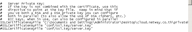 4. เมื่อเลื่อนลงมาข้างล่างหน่อยจะพบข้อความดังรูปตัวอย่าง SSLCertificatekeyfile คือต้องการบอกที่อยู่ของไฟล์ Privatekey.key ซึ่งตัวอย่างคือนำไฟล์ key มาไว้ที่ Desktop แล้วนั้นจึงทำการระบุที่อยู่ไฟล์ลงไปดังรูปตัวอย่าง