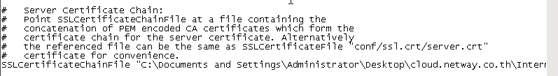 5. เมื่อเลื่อนลงมาข้างล่างหน่อยจะพบข้อความดังรูปตัวอย่าง SSLCertificateChainFile คือต้องการบอกที่อยู่ของไฟล์ IntermediateCA.crt ซึ่งตัวอย่างคือนำไฟล์ IntermediateCA.crt มาไว้ที่ Desktop แล้วนั้นจึงทำการระบุที่อยู่ไฟล์ลงไปดังรูปตัวอย่าง