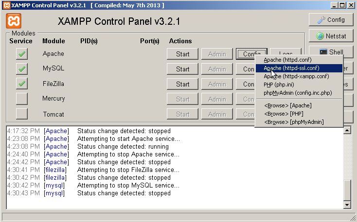2. เริ่มต้นเมื่อเปิดโปรแกรม xampp ขึ้นมาแล้วให้ไปที่ปุ่ม Config แล้วเลือกเมนู Apache(httpd-ssl.conf) เพื่อจะทำกการติดตั้ง SSL ลงบน xampp