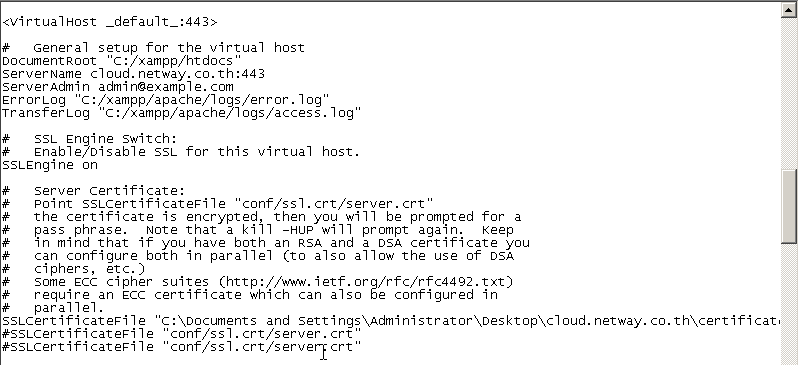 3. เมื่อเข้ามาสู่หน้า Apache(httpd-ssl.conf) แล้วนั้นให้ตรวจเช็ดดูว่า virtualHost _default_:433 นั้นเป็น port 443 หรือไม่ถ้าไม่ได้เป็น 443 ให้ทำการเปลี่ยนให้เรียบร้อย แล้วตรวจสอบความเรียบร้อยด้วยว่า “SSLEngine on” ต้องเป็น on เท่านั้น และ SSLCertificateFile นั้นให้ทำการบอกที่อยู่ของไฟล์ Certificate.crt จากตัวอย่างในรูปนั้นไฟล์ได้อยู่ที่หน้า Desktop ในโฟลเดอร์ cloud.netway.co.th แล้วตามด้วยชื่อไฟล์