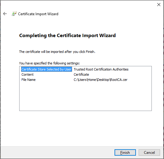 8. เลือก “Place all certificate in the following store” จากนั้นกด Next และ Finish