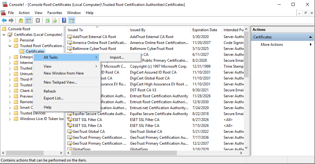 6. เลือกหัวข้อ Trusted Root Certification Authority คลิกขวาที่ Folder Certificate เลือก All Task > Import