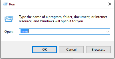 2. ให้ทำการเปิด MMC Console โดยเปิด Run > mmc