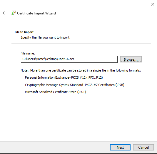 7. เลือก Next > เลือกไฟล์ Root CA ที่ได้ทำการ Save ไว้ และกด Next