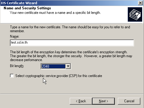 8. ตรงช่อง Name ให้ทำการกำหนดชื่อ CSR ที่ต้องการและเลือก Bit lengthg เป็น 2048 ในส่วนช่อง Select crytographic service provide(CSP) for this certificate นั้นปล่อยว่างไว้ไม่ต้องไปติ๊กเครื่องหมายถูก แล้วทำการกด Next