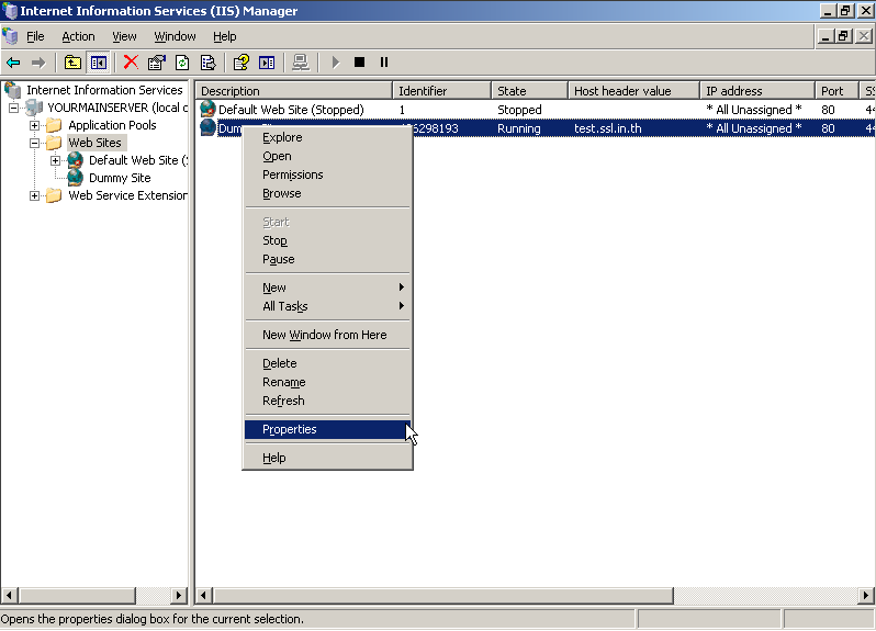3. เลือก Dummy Site ของตนเอง แล้วคลิกขวาจากนั้นไปที่ Properties