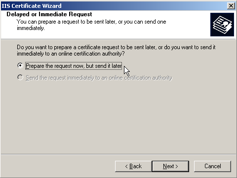 7. จากนั้นให้ทำการเลือก Prepare the request now, but send it later แล้วกด Next เพื่อเข้าสู่ขั้นตอนถัดไป