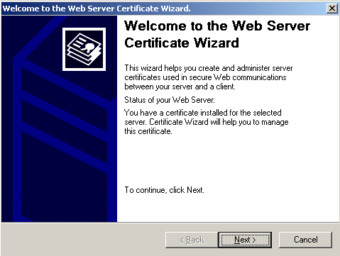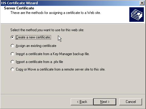 6. เมื่อเข้ามาสู่หน้า IIS Certificate Wizard ให้ทำการเลือก Create a new certificate แล้วกด next เพื่อเข้าสู่ขั้นตอนถัดไป