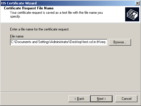 10. ระบุที่ตั้งไฟล์ที่ต้องการเก็บไฟล์ CSR และกำหนดชื่อไฟล์ที่ต้องการ เสร็จแล้วให้ทำการกด Next เพื่อเข้าสู่ขั้นตอนถัดไป