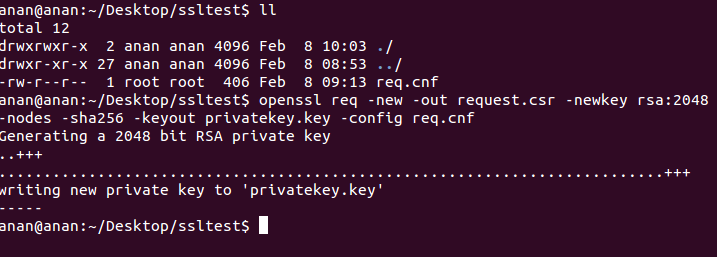 openssl req -new -out /[Path]/request.csr -newkey rsa:2048 -nodes -sha256 -keyout /[Path]/privatekey.key -config req.cnf