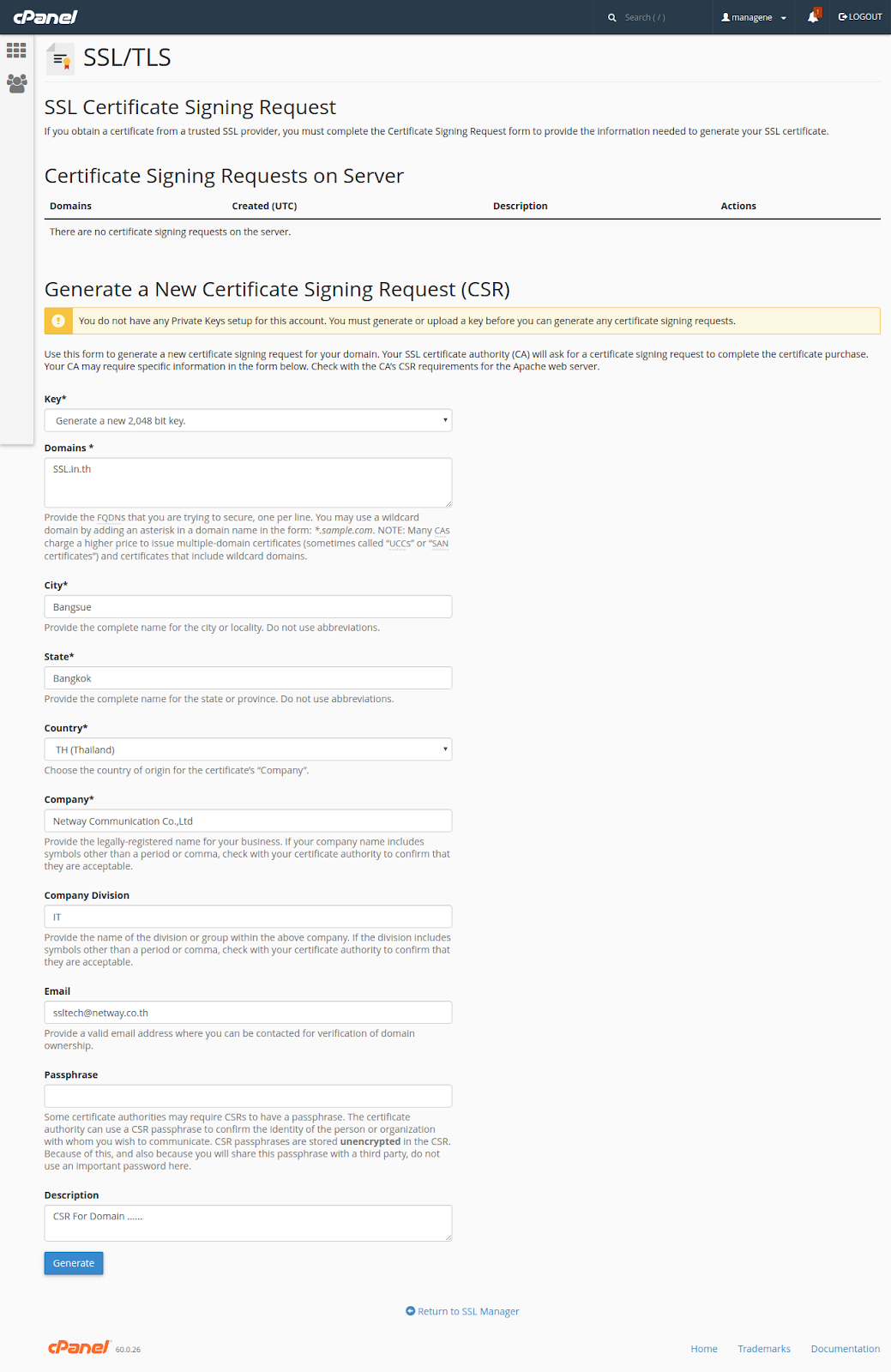 4. ทำการระบุค่าต่างๆ ให้ถูกต้อง แล้วทำการ Generate CSR ขึ้นมา