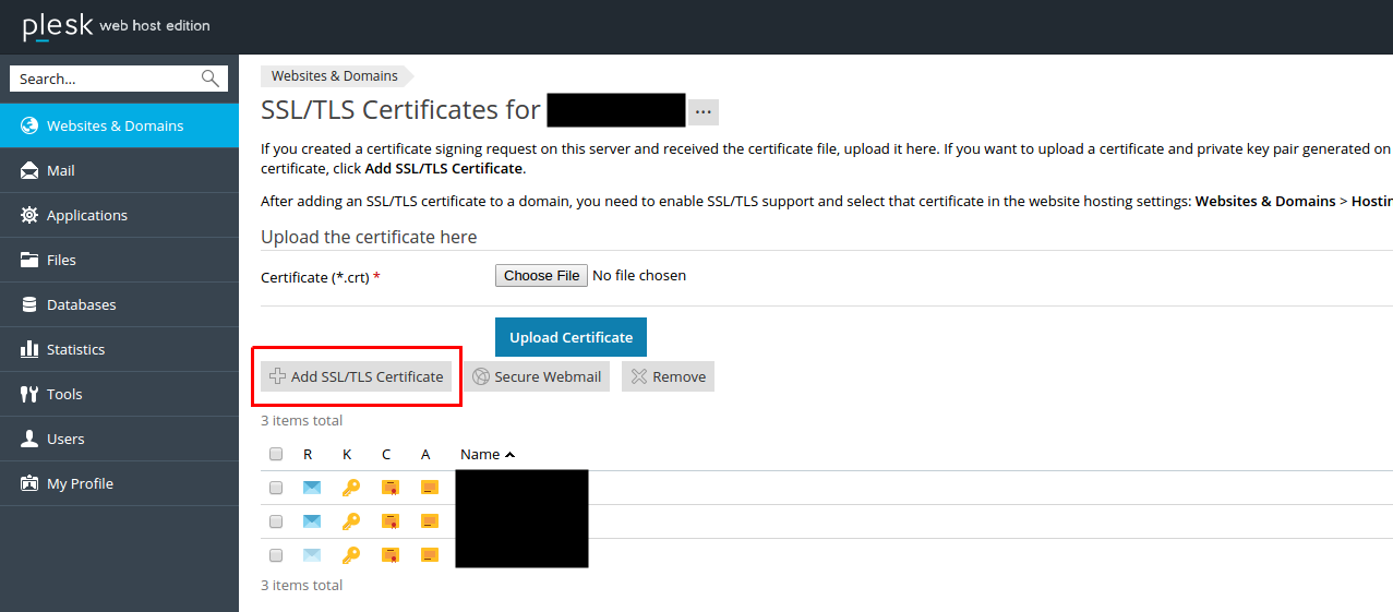 2. เมื่อเข้าสู่เมนู SSL/TLS Certificates แล้ว เลือก Add SSL/TLS Certificate