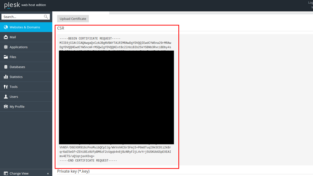 4. เมื่อกด Request ตามหัวข้อที่ 3 แล้ว ระบบจะทำการ Generate CSR และ Private Key ขึ้นมาให้ ให้ผู้ใช้งานเลื่อนลงมาด้านล่างจนเจอคำว่า CSR ให้ผู้ใช้งานคัดลอก Code ดังกล่าวส่งให้ทีมงาน SSL.in.th เพื่อดำเนินการออก SSL certificate ต่อไป