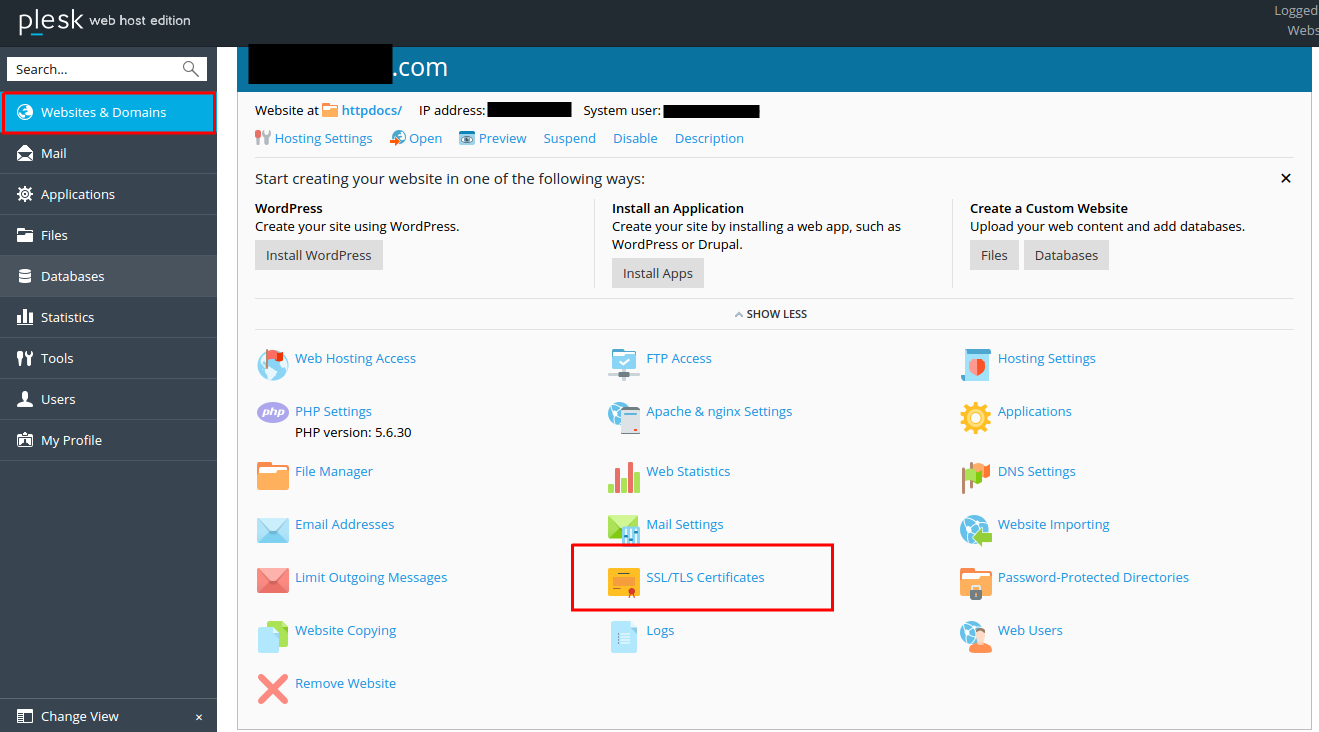 1. เมื่อผู้ใช้งาน Login เข้ามาในระบบแล้ว ให้เข้าสู่เมนู Websites & Domains > Domain ที่ต้องการ > ไปที่เมนู SSL/TLS Certificates