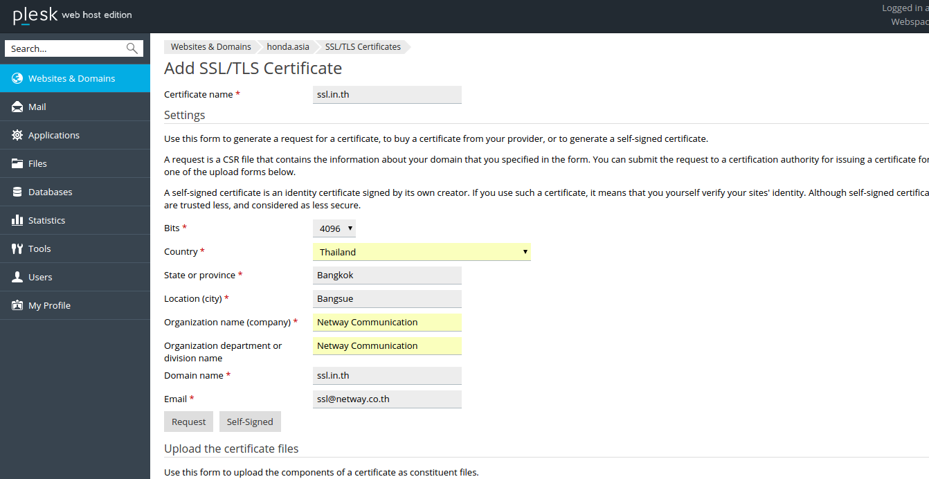 3. ดำเนินการกรอกชื่อ และรายละเอียดที่ต้องการ Generate CSR โดยข้อมูลที่กรอกนั้นให้อ้างอิงตามฐานข้อมูลบน WHOIS เมื่อใส่ข้อมูลครบทั้งหมดแล้ว ให้กดปุ่ม Request
