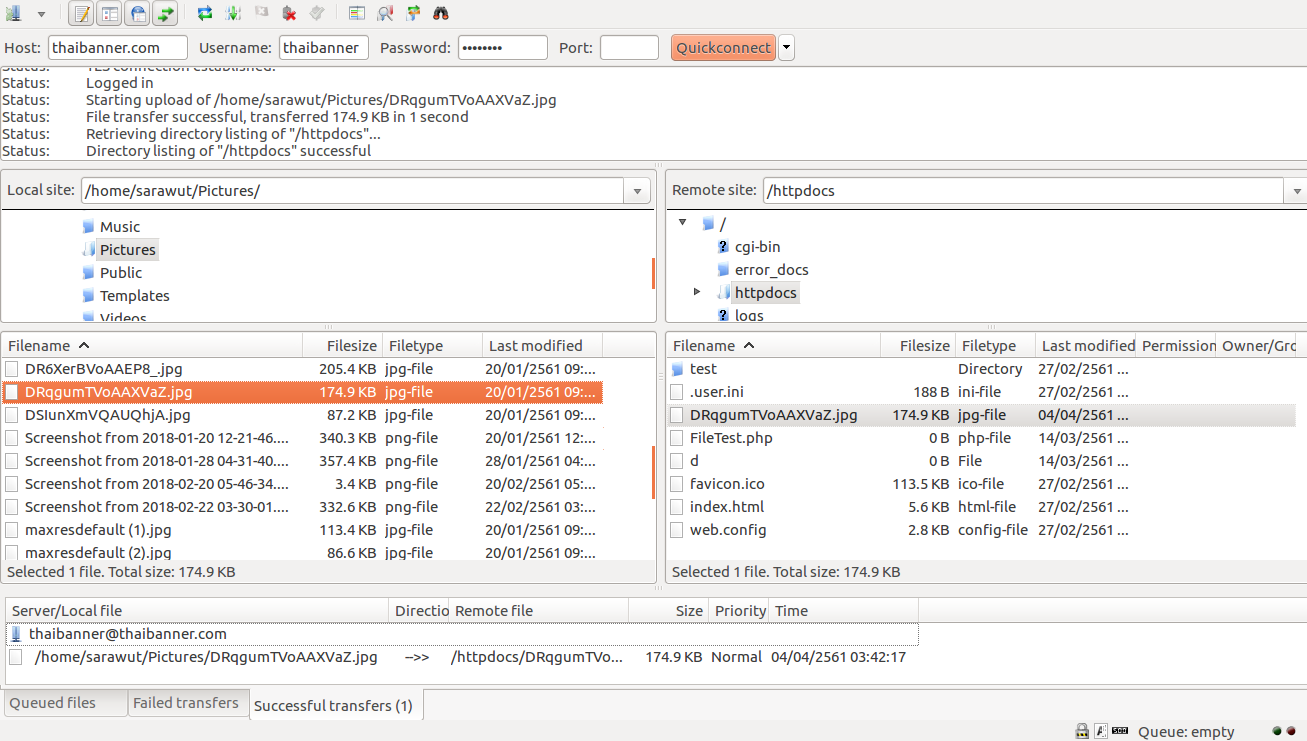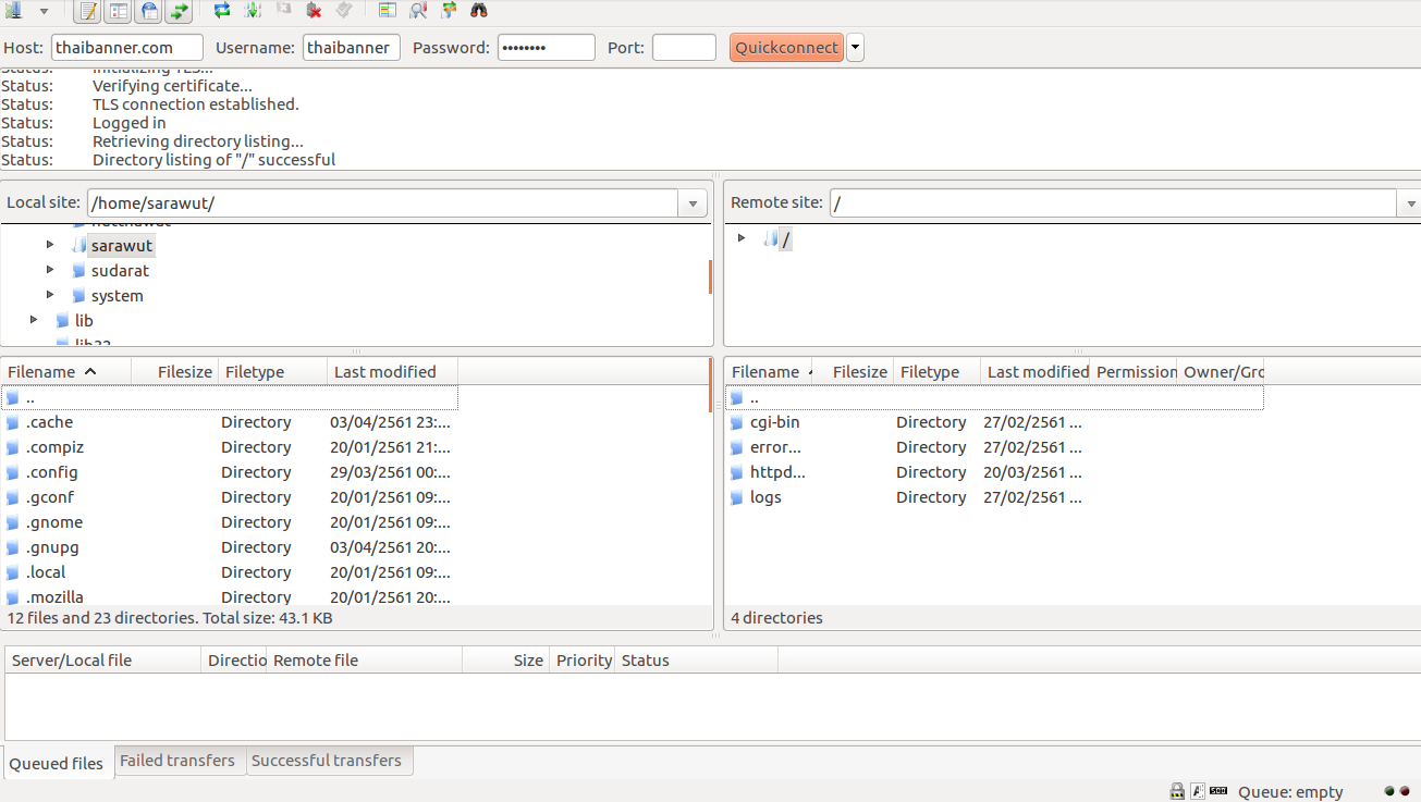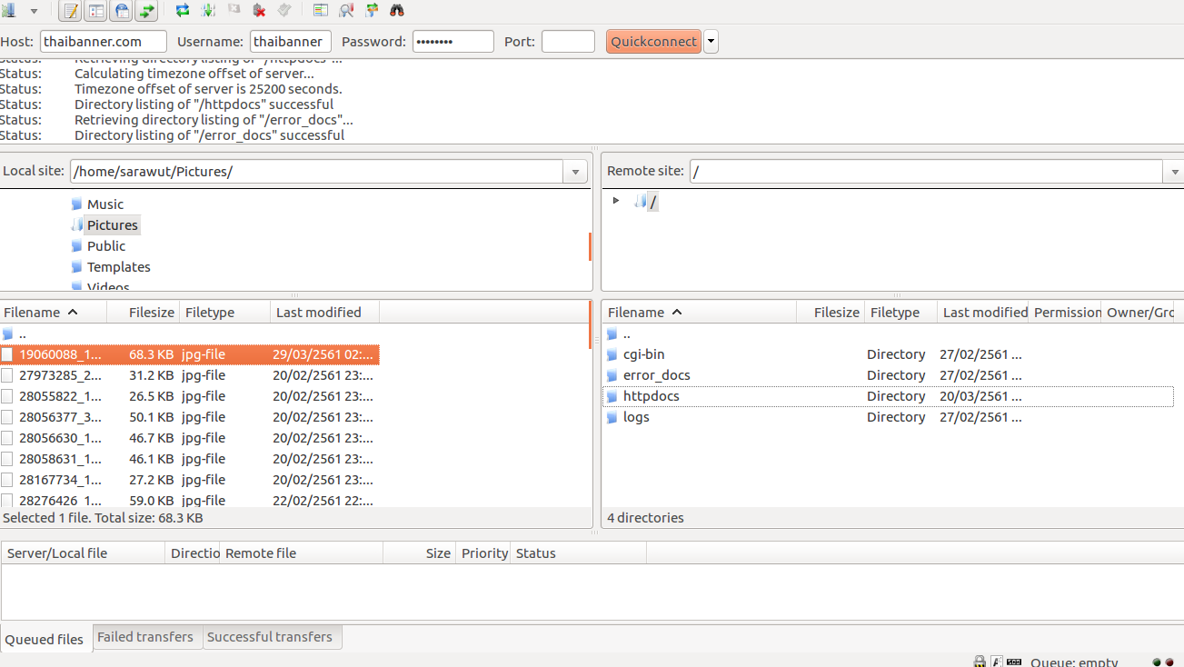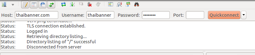 3. ทำการเชื่อมต่อกับเซิร์ฟเวอร์ด้วยการคลิกที่ Quickconnect โปรแกรมก็จะทำการเชื่อมต่อให้ โดยจะเห็นว่า โปรแกรมจะแสดงผลว่า Directory listing of "/" successful และทางขวาของโปรแกรมก็จะแสดงรายละเอียดของ ข้อมูลฝั่งเซิร์ฟเวอร์ขึ้นมา