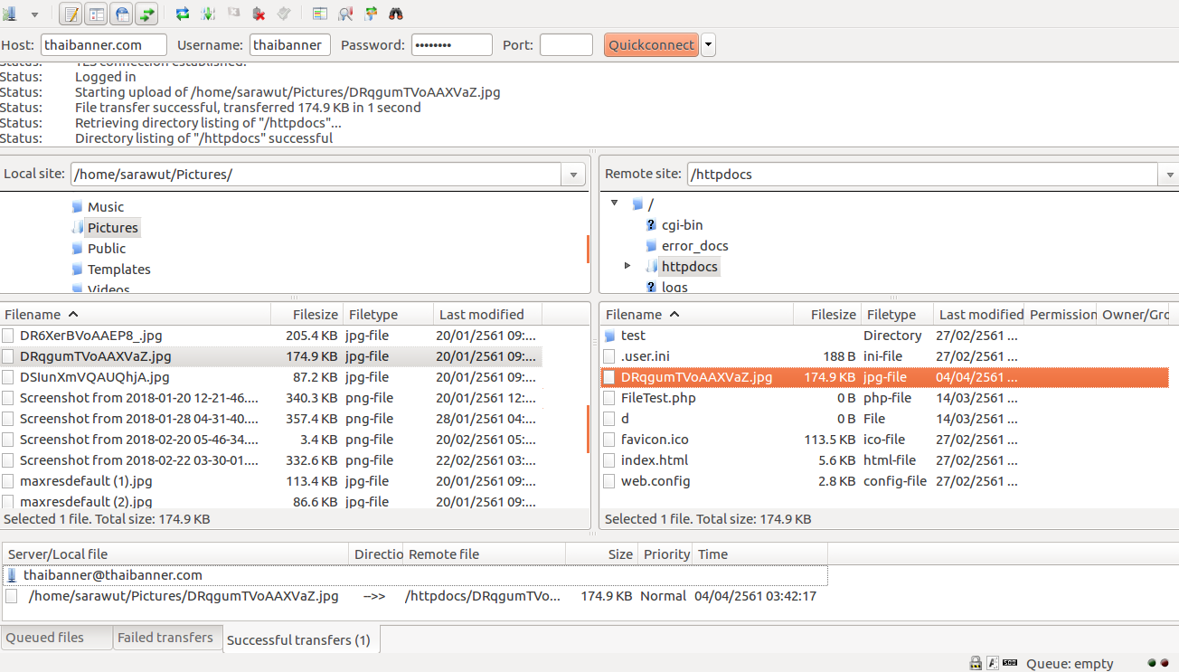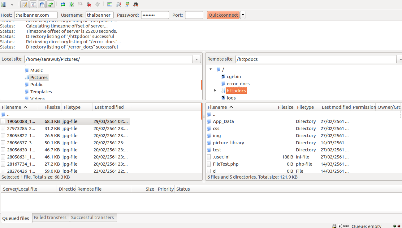 6. จากนั้นก็ทำการเลือกไฟล์ที่ต้องการจะอัพโหลดในฝั่งซ้ายที่เป็นข้อมูลในเครื่องคอมพิวเตอร์ของท่าน แล้วลากไปยังฝั่งซ้าย วางไว้ในโฟลเดอร์httpdocs หรือโฟลเดอร์ที่ต้องการ แต่ต้องอยู่ภายใต้โฟลเดอร์ httpdocs โปรแกรมก็จะเริ่มทำการอัพโหลดข้อมูลให้ตามภาพ