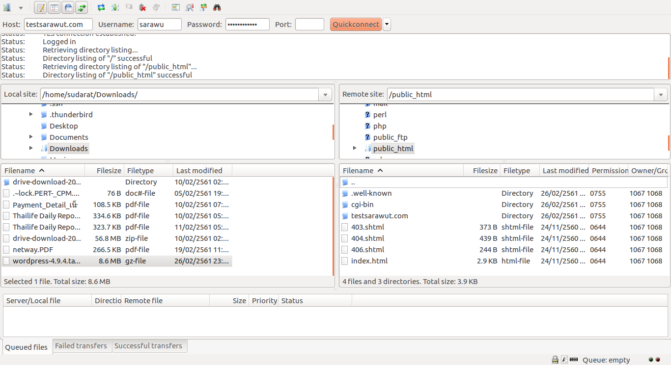 6. จากนั้นก็ทำการเลือกไฟล์ที่ต้องการจะอัพโหลดในฝั่งซ้ายที่เป็นข้อมูลในเครื่องคอมพิวเตอร์ของท่าน แล้วลากไปยังฝั่งซ้าย วางไว้ในโฟลเดอร์ public_html หรือโฟลเดอร์ที่ต้องการ แต่ต้องอยู่ภายใต้โฟลเดอร์ public_html โปรแกรมก็จะเริ่มทำการอัพโหลดข้อมูลให้ตามภาพ