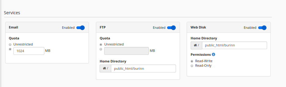 5. เลื่อนลงมาด้านล่างจะมีรายละเอียดให้เรากำหนดว่า Web User นี้จะสามารถเข้าถึงในส่วนใดได้บ้าง เช่น Email, FTP ,Web Disk ซึ่งหากลูกค้าต้องการเปิดใช้งานให้ Service ใดให้ทำการกด Enable ข้างบนได้เลยครับ